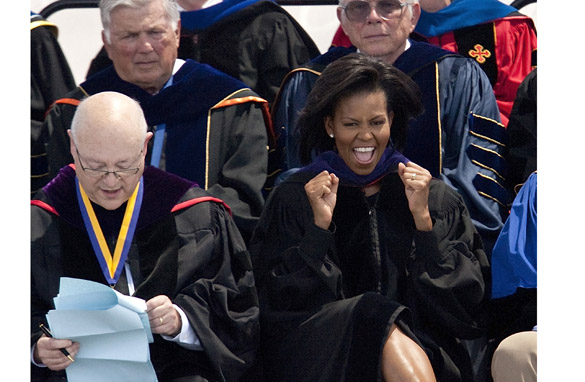 First Lady Michelle Obama gestures before delivering the commencement speech at the University of California, Merced on May 16, 2009 in Merced, California. (Photo by David Paul Morris/Getty Images)