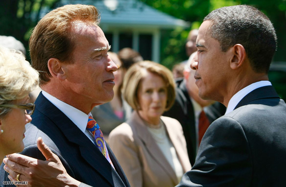US President Barack Obama greets California Gov. Arnold Schwarzenegger during a press conference announcing fuel efficiency standards in the Rose Garden of the White House May 19, 2009 in Washington, DC.