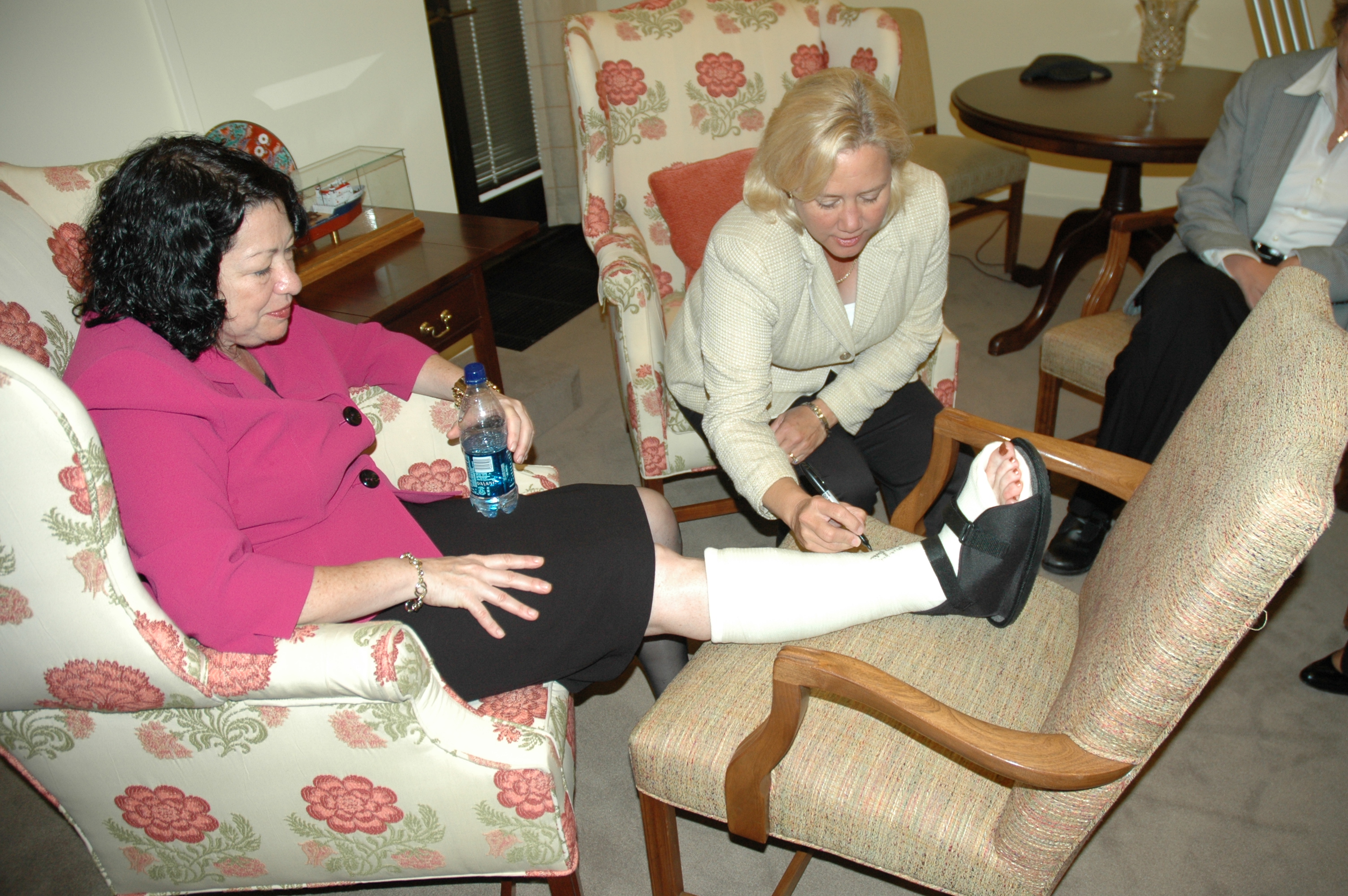 Editor's Note: Supreme Court nominee Sonia Sotomayor broke her ankle Monday morning on her way to Washington for another round of meetings on Capitol Hill with senators weighing her nomination, according to the White House. Here, Senator Mary Landrieu signs the Supreme Court nominee's new cast.