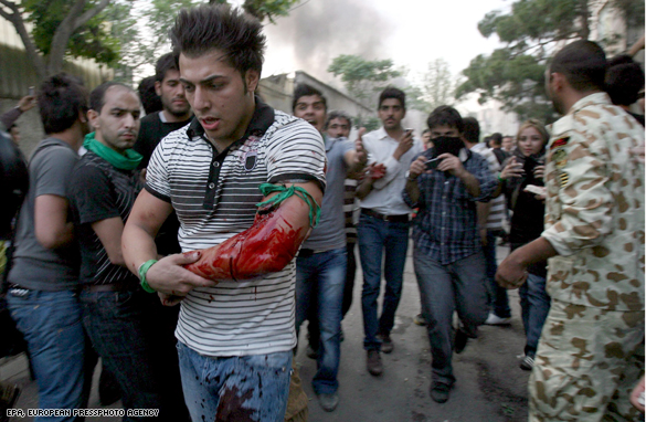 A demonstrator who was shot during a protest demonstration in the streets of the capital Tehran, Iran, on 15 June 2009. The rally was attended by hundreds of thousands of Iranians who protested against alleged election fraud at the presidential election which led to the re-election of President Mahmoud Ahmadinejad.