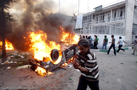 Protesters burn a car and attack a building of a pro-government militia (Basij) base near a protest demonstration in the streets of the capital Tehran, Iran, on 15 June 2009. The rally was attended by hundreds of thousands of Iranians who protested against alleged election fraud at the presidential election which led to the re-election of President Mahmoud Ahmadinejad.