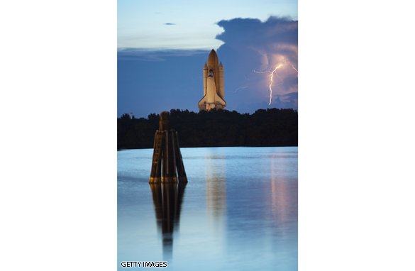 Space Shuttle Discovery rolls out to launch pad 39-A at the Kennedy Space Center in Cape Canaveral, Florida, August 4, 2009. It is scheduled to launch to the International Space Station no earlier than August 25th. (Photo by Matt Stroshane/Getty Images.)