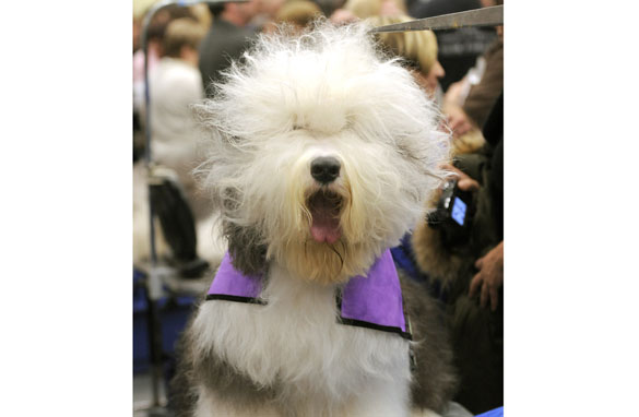 An Old English Sheepdog sits backstage during the first day of the 134th Westminster Kennel Club Dog Show at Madison Square Garden in New York.